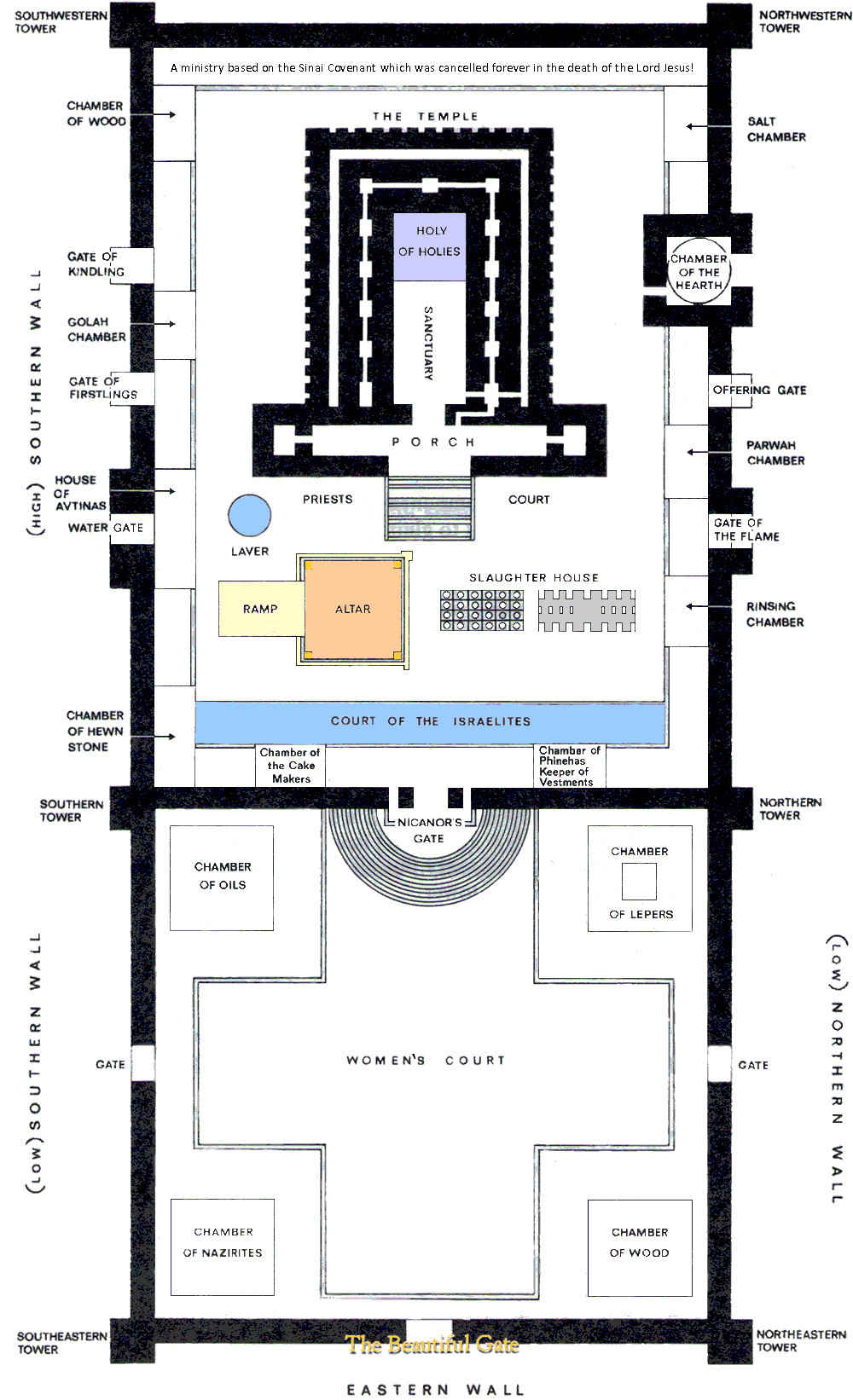 According to Josephus, a 1st century Roman historian, there were ten entrances into the inner courts – four on the south, four on the north, one on the east and one leading east to west from the Court of the Women to the Court of the Israelites, named the Nicanor Gate. The gates were – on the south side (going from west to east) the Fuel Gate, the Firstling Gate, the Water Gate and the Women’s gate. On the north side, from west to east, were the Jeconiah Gate, the Offering Gate, the Song Gate and the Women’s Gate.