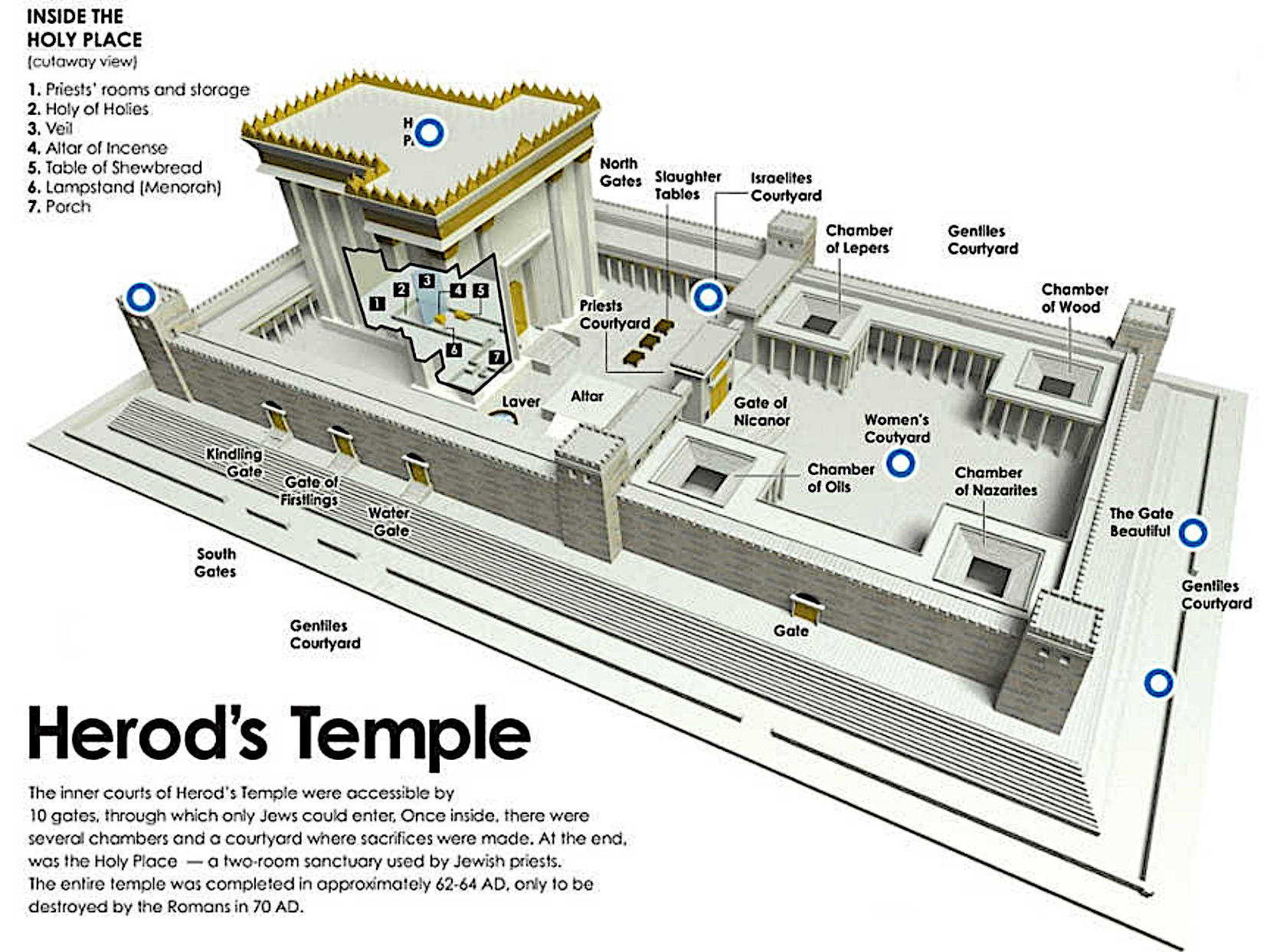 The temple contained 4 different courts; the Court of the Priests, the Court of the Israelites, the Court of the Women and finally the Court of the Gentiles. The Court of the Gentiles was the most outer court encompassing the temple. Despite the whole of the temple being considered holy, this was the least holy court in the temple.