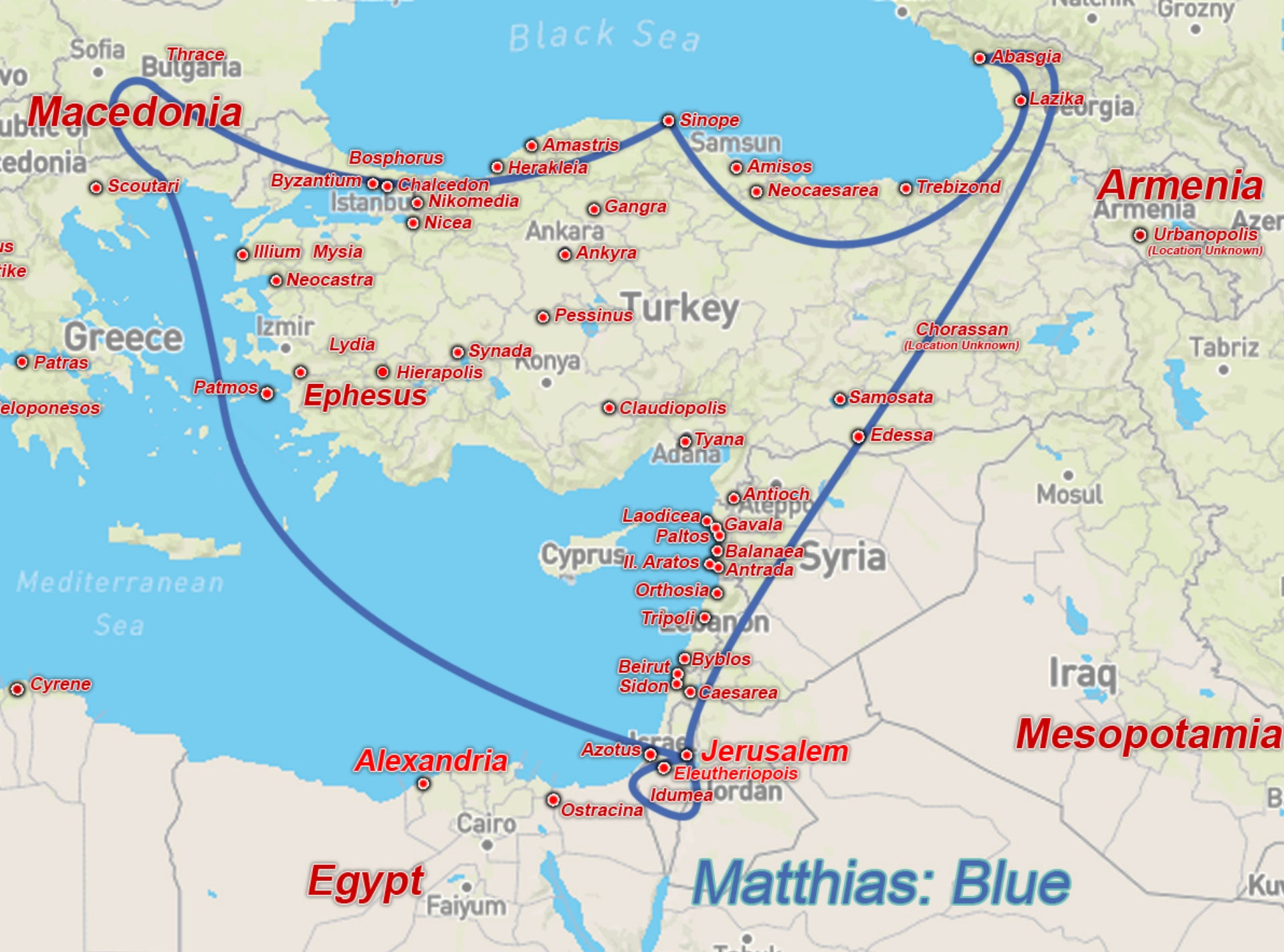 Again, as in the case of the Apostle Matthew, it should be noted that it is not modern Ethiopia that is being referred to here, but refers more generally to the land where the black-skinned people lived. This is often a reference to the area from southern Egypt to northern Sudan – or even more generally, everywhere south of Egypt. Though, there are a number of other places which were referred to as “where the dark-skinned people dwell” including the modern Republic of Georgia, east of the Black Sea. In the case of Matthias, his ministry appears to have been in the latter, the Clochis region of Georgia.